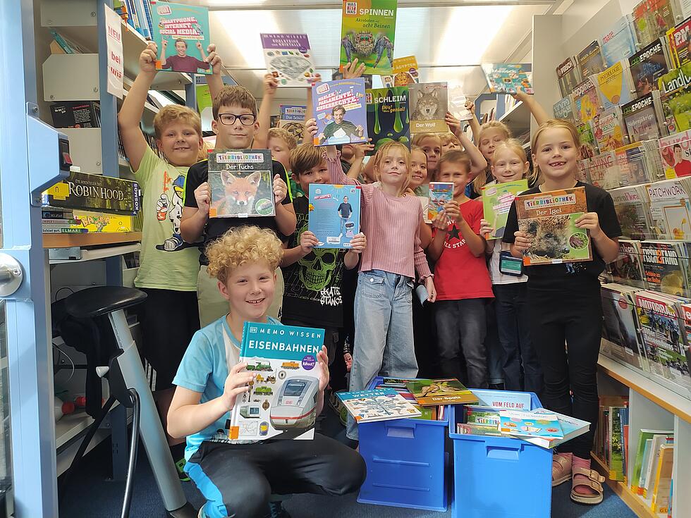 So erging es den Schülerinnen und Schülern der Grundschule Hutzfeld am 18.09.2025. Zusammen mit ihrer Lehrerin Eva von Lucke „enterten“ sie den Bücherbus und nahmen jede Menge neuer Sachbücher in Empfang.